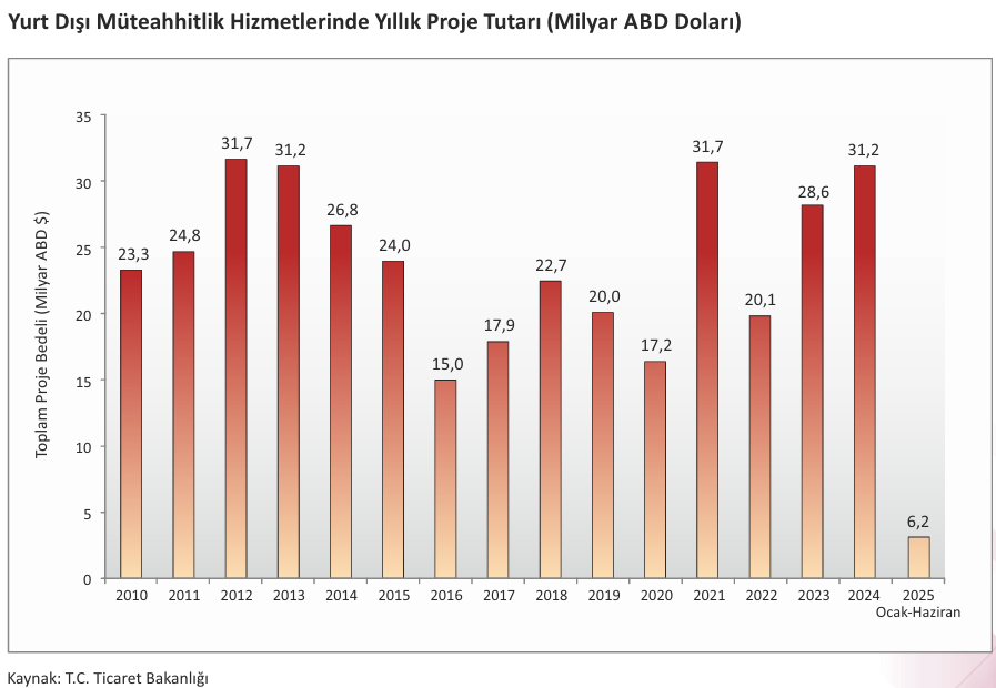 Yurt Dışı Müteahhitlik Hizmetleri (YDMH) kapsamında Ocak-Haziran 2025 dönemi itibarıyla Türk inşaat sektörü tarafından yurt dışında 6,2 milyar ABD Doları tutarında 93 proje üstlenilmiştir.