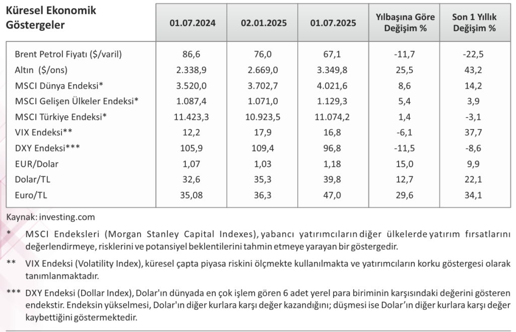 Haziran ayının ilk yarısında ABD’de beklentilerin altında açıklanan enflasyon verileri ve devam eden ticaret anlaşması görüşmeleri piyasalara destek sağlamıştır. Ancak ayın ikinci yarısında Orta Doğu’da İran ile İsrail arasında yaşanan gerilim, küresel risk algısını yeniden yükseltmiştir. Çatışma süresince baskı altında kalan risk iştahı, ateşkes sağlanmasıyla birlikte toparlanmış ve borsalarda güçlü bir yükseliş yaşanmıştır. Böylece, S&P 500 ve Nasdaq’ın öncülüğünde MSCI Dünya Endeksi Haziran’da %4,22 artış kaydederken, gelişmekte olan ülke borsaları endeksi %5,65 yükselmiştir.