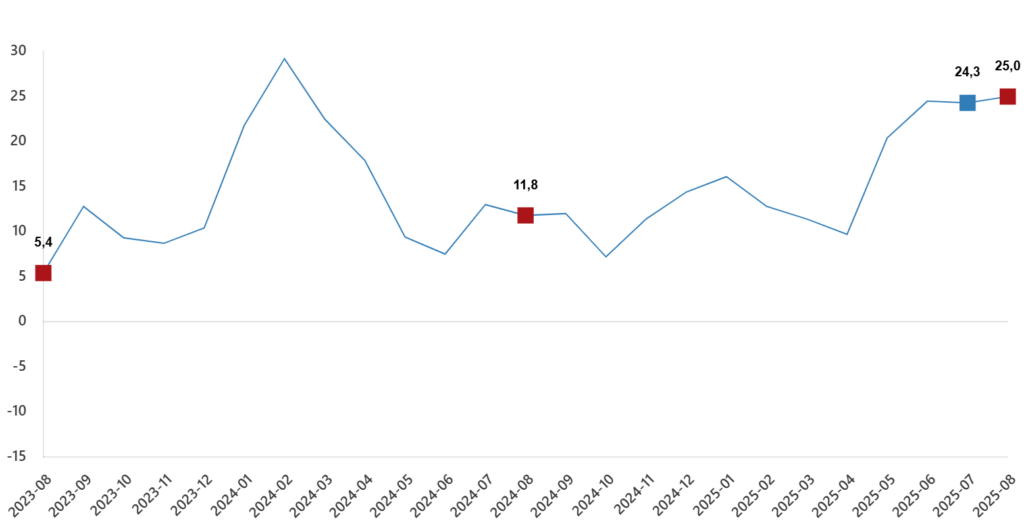 Endeksa; “Türkiye Genelinde 2025 Ağustos Satılık Konut Fiyatları Yıllık Değer Artışı nominal olarak yüzde 29,1 oldu.”